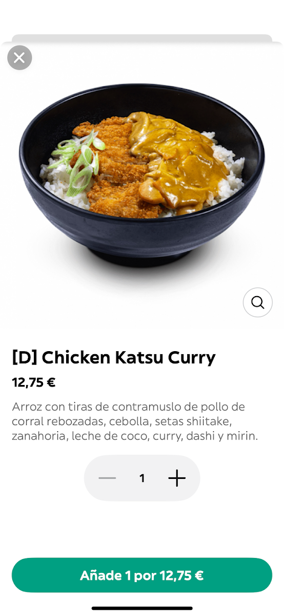 Arroz con tiras de contramuslo de pollo de corral rebozadas, cebolla, setas shiitake, zanahoria, leche de coco, curry, dashi y mirin